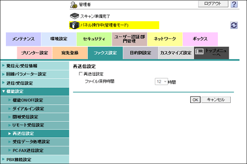 管理者モードの[ファクス設定]-[機能設定]-[再送信設定]で、次の設定をします。
