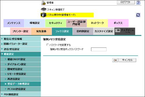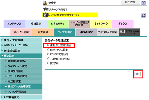 管理者モードの[ファクス設定]-[機能設定]-[受信データ処理設定]で、[強制メモリ受信設定]を選び、[OK]をクリックします。