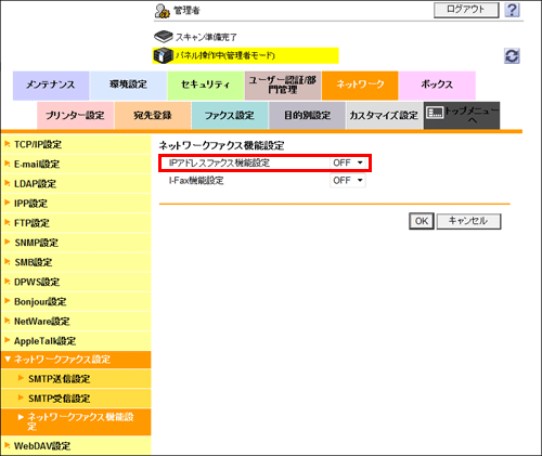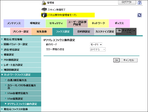 管理者モードの[ネットワーク]ー[ネットワークファクス設定]-[ネットワークファクス機能設定]で、[IPアドレスファクス機能設定]を[ON]に設定します(初期値:[OFF])。