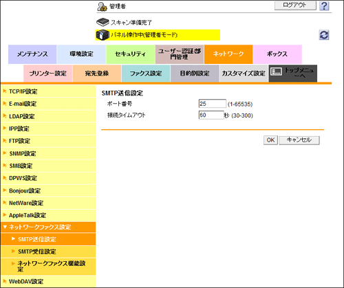 管理者モードの[ネットワーク]-[ネットワークファクス設定]-[SMTP送信設定]で、次の設定をします。