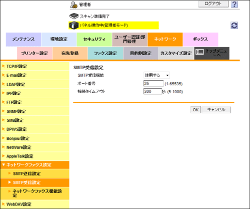 管理者モードの[ネットワーク]-[ネットワークファクス設定]-[SMTP受信設定]で、次の設定をします。