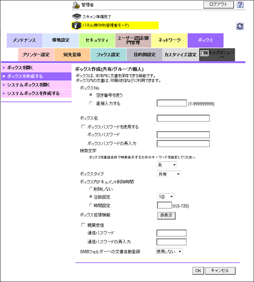 管理者モードの[ボックス]-[ボックスを作成する]で、次の設定をします。