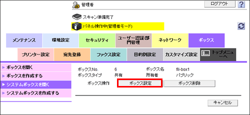 管理者モードにログインすると、ファイリングナンバーボックスのパスワードを入力しなくても、登録されているファイリングナンバーボックスの設定を変更したり、削除したりできます。