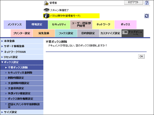 管理者モードの[環境設定]-[ボックス設定]-[不要ボックス削除]で、[OK] をクリックします。