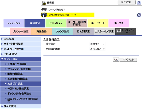 管理者モードの[環境設定]-[ボックス設定]-[文書保持設定]で、次の設定をします。