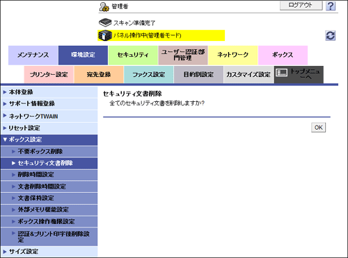 管理者モードの[環境設定]-[ボックス設定]-[セキュリティ文書削除]で、[OK]をクリックします。