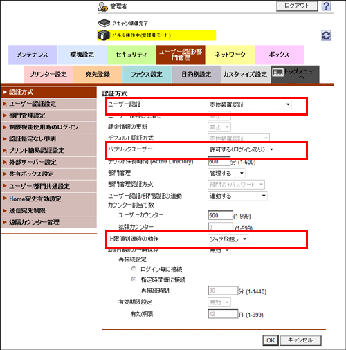 管理者モードの[ユーザー認証/部門管理]-[認証方式]で、次の設定をします。