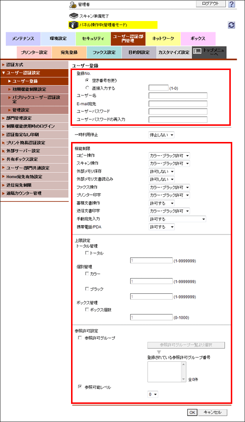 管理者モードの[ユーザー認証/部門管理]-[ユーザー認証設定]-[ユーザー登録]-[新規登録]で、ユーザーを登録します。