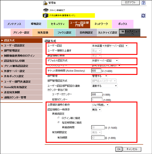 2. 管理者モードの[ユーザー認証/部門管理]-[認証方式]で、次の設定をします。