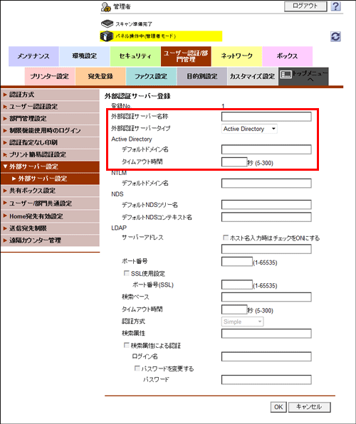 • 本機とActive Directoryとで、日時を合わせる必要があります。本機の日時設定については、こちらをごらんください。