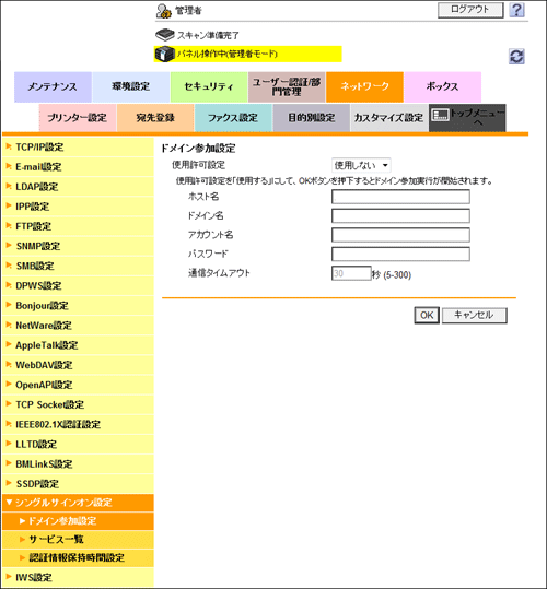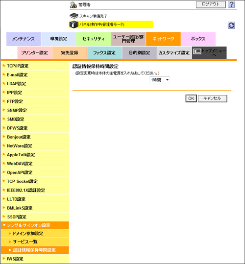 3. 必要に応じて、管理者モードの[ネットワーク]-[シングルサインオン設定]-[認証情報保持時間設定]で、本機に認証情報を保持しておく時間を変更します。