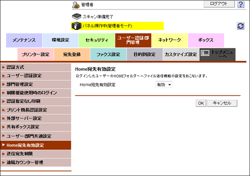 管理者モードの[ユーザー認証/部門管理]-[Home宛先有効設定]で、[Home宛先有効設定]を[有効]に設定します(初期値:[無効])。