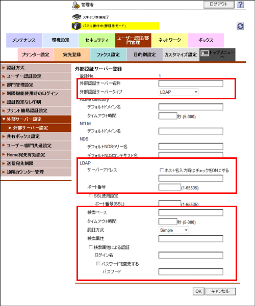 [外部認証サーバー名称] | お使いのLDAPサーバーの名前を入力します(半角32文字以内)。 登録するLDAPサーバーに、わかりやすい名前をつけます。 |