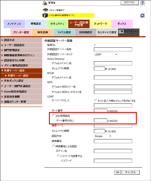 管理者モードの[ユーザー認証/部門管理]-[外部サーバー設定]-[編集]で、次の設定をします。