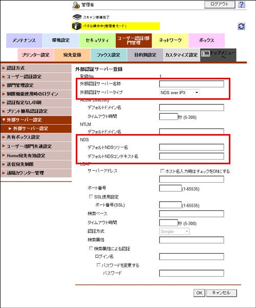 [外部認証サーバー名称] | お使いのNDSサーバーの名前を入力します(半角32文字以内)。 登録するNDSサーバーに、わかりやすい名前をつけます。 |