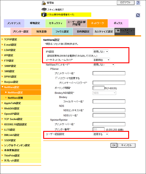 管理者モードの[ネットワーク]-[NetWare設定]-[NetWare設定]で、次の設定をします。