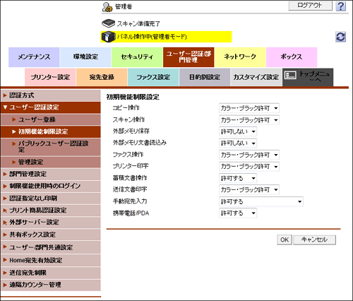 はじめて本機にログインしたユーザーは、ここで設定した内容に従って、使える機能が制限されます。