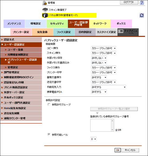 パブリックユーザー(登録されていないユーザー)の使用を許可する場合は、パブリックユーザーが使える機能を制限できます。また、パブリックユーザーが参照できる宛先を制限することもできます。