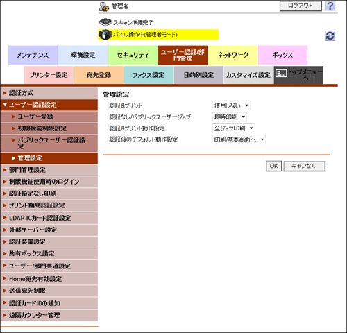 認証&プリント機能の動作を設定します。また、パブリックユーザーからの印刷ジョブや、認証情報のない印刷ジョブを受信したときの動作を設定します。
