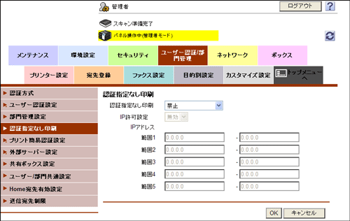 [IP許可設定] | [認証指定なし印刷]で[カラー・ブラック許可]または[ブラックのみ許可]を選んだ場合に、印刷を許可するコンピューターをIPアドレスで制限するときは[有効]を選びます。あわせて、IPアドレスの範囲を入力します。 1つのIPアドレスからのアクセスを許可する場合は、片方だけの入力でも設定できます。