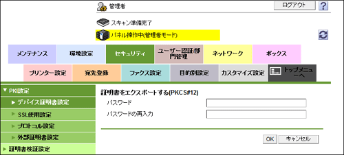 管理者モードの[セキュリティ]-[PKI設定]-[デバイス証明書設定]-[設定]-[証明書をエクスポートする]で、パスワードを入力し(半角32文字以内)、[OK]をクリックします。