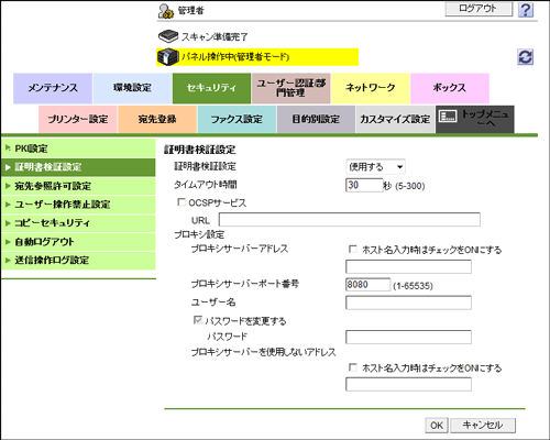 管理者モードの[セキュリティ]-[証明書検証設定]で、次の設定をします。