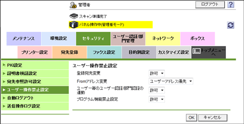 [プログラム機能禁止設定] | ユーザーに対して、コピープログラムやファクス/スキャンプログラムの使用を禁止する場合は、[禁止]を選びます。 初期値は[許可]です。 |