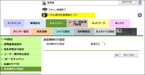 管理者モードの[セキュリティ]-[送信操作ログ設定]で、[取得する]を選びます(初期値:[取得しない])。