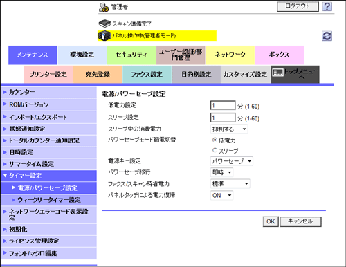 管理者モードの[メンテナンス]-[タイマー設定]-[電源/パワーセーブ設定]で、次の設定をします。