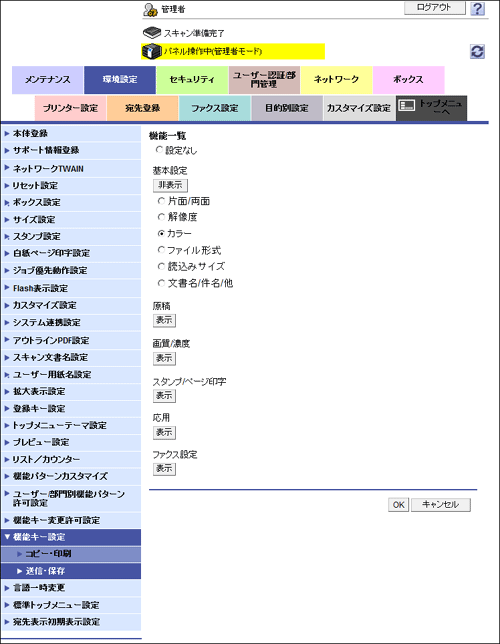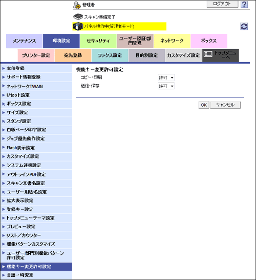 [送信・保存] | ファクス/スキャンモードのトップ画面と、ボックスモードの送信設定画面、保存設定画面に表示する機能キーの変更を許可するかどうかを選びます。 初期値は[禁止]です。 |