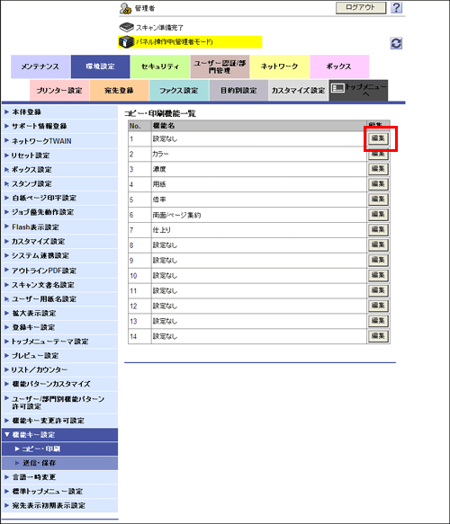 管理者モードの[環境設定]-[機能キー設定]-[コピー・印刷]で、設定を変更したい機能キーの番号を選び、[編集]をクリックします。