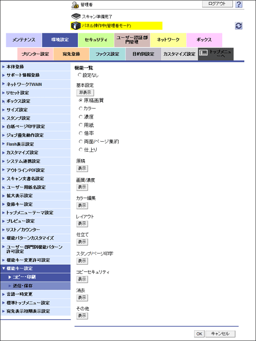 [コピー・印刷] | コピーモードのトップ画面と、ボックスモードの印刷設定画面に表示する機能キーの変更を許可するかどうかを選びます。 初期値は[禁止]です。 |