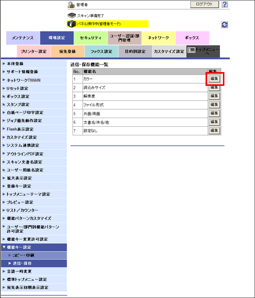 管理者モードの[環境設定]-[機能キー設定]-[送信・保存]で、設定を変更したい機能キーの番号を選び、[編集]をクリックします。