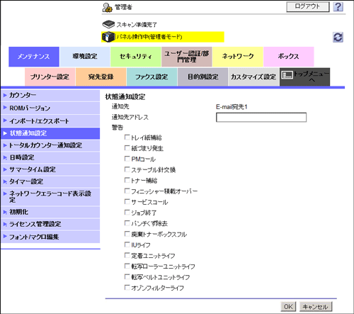 管理者モードの[メンテナンス]-[状態通知設定]-[E-mail宛先]-[編集]で、次の設定をします。