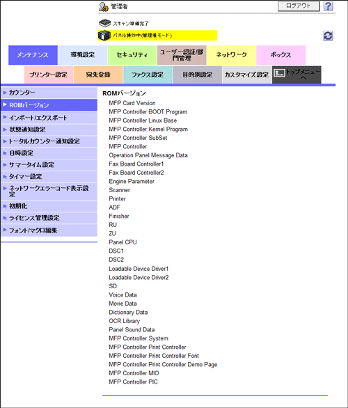 管理者モードの[メンテナンス]-[ROMバージョン]で、本機のROMバージョンを確認します。