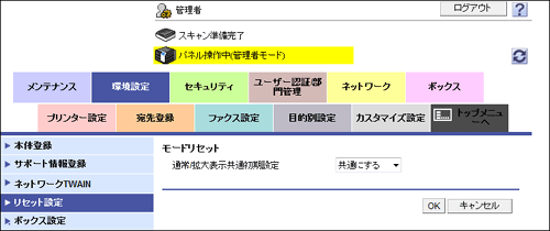 通常と拡大表示の設定値の変更を同時に行いたいときに、管理者モードの[環境設定]-[リセット設定]で、[通常/拡大表示共通初期設定]を[共通にする]を選びます(初期値:[共通にしない])。