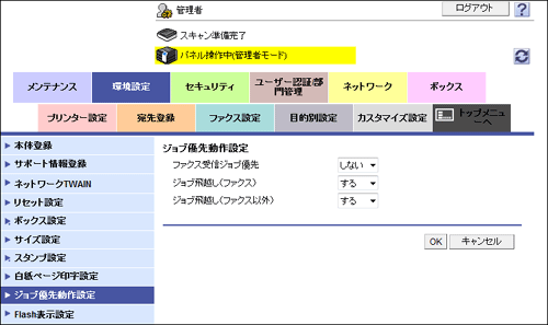 管理者モードの[環境設定]-[ジョブ優先動作設定]で、次の設定をします。