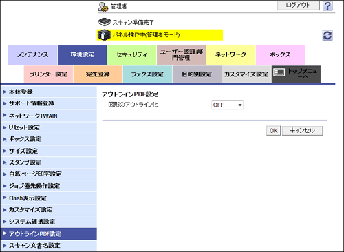 管理者モードの[環境設定]-[アウトラインPDF設定]で、次の設定をします。