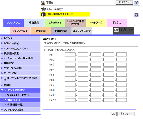 管理者モードの[メンテナンス]-[ライセンス管理設定]-[機能有効化]で、トークン番号を入力し、[OK]をクリックします。