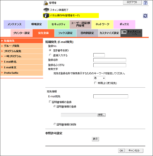 管理者モードの[宛先登録]-[短縮宛先]-[新規登録]-[E-mail宛先]-[OK]をクリックし、次の設定をします。