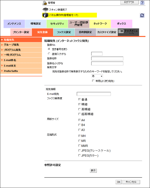 管理者モードの[宛先登録]-[短縮宛先]-[新規登録]-[インターネットファクス宛先]-[OK]をクリックし、次の設定をします。