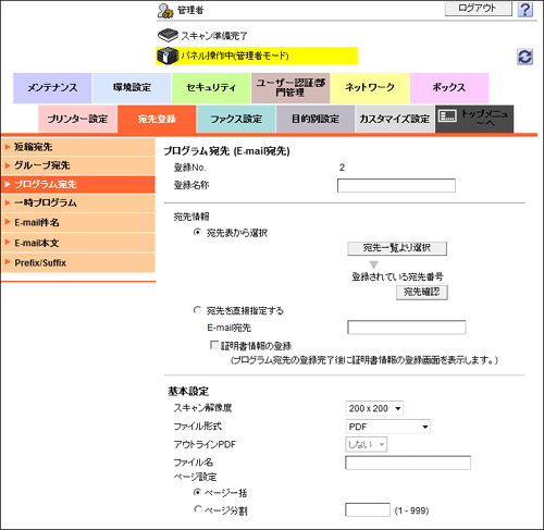 管理者モードの[宛先登録]-[プログラム宛先]- [登録]- [E-mail宛先]-[OK]をクリックし、次の設定をします。