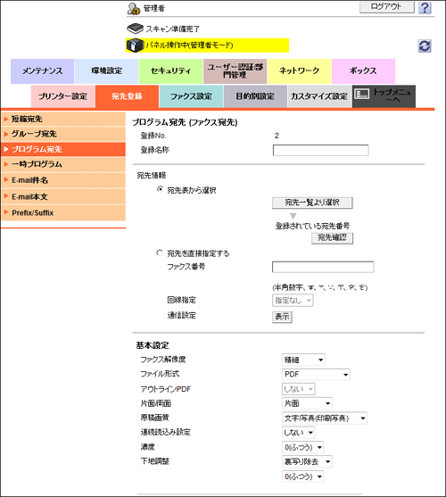 管理者モードの[宛先登録]-[プログラム宛先]-[登録]-[ファクス宛先]-[OK]をクリックし、次の設定をします。