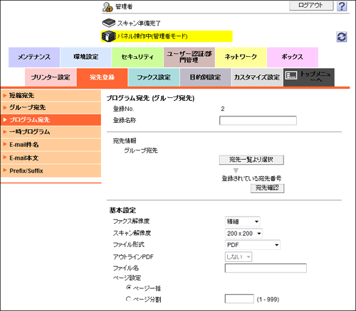 管理者モードの[宛先登録]-[プログラム宛先]-[登録]-[グループ宛先]-[OK]をクリックし、次の設定をします。