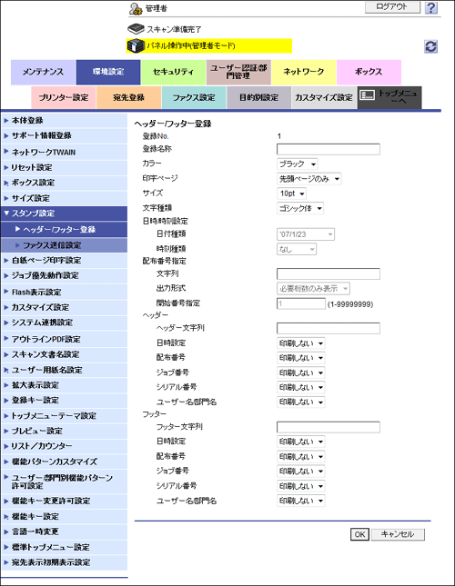 原稿を印刷するときに、ここで登録したヘッダー/フッターを呼出して、ページの上部または下部に印字できます。ヘッダー/フッターは、20件まで登録できます。