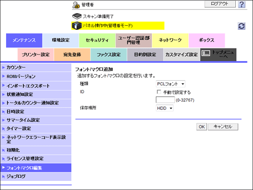フォントやマクロを本機に追加します。また、登録したフォントやマクロを削除します。