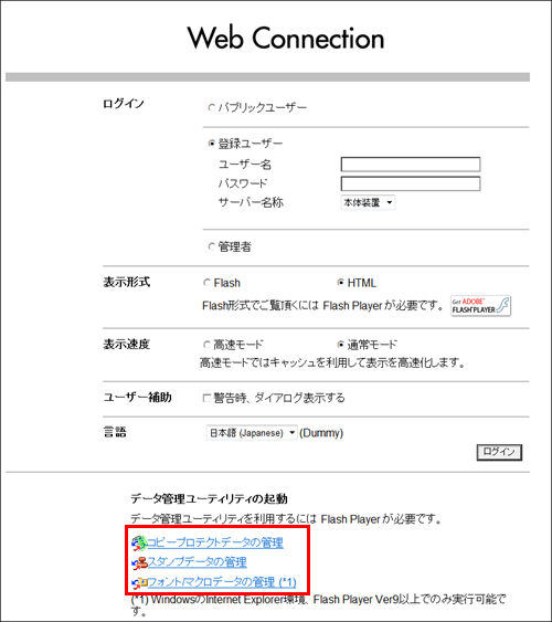 データ管理ユーティリティーは、Web Connectionのログイン画面から起動します。