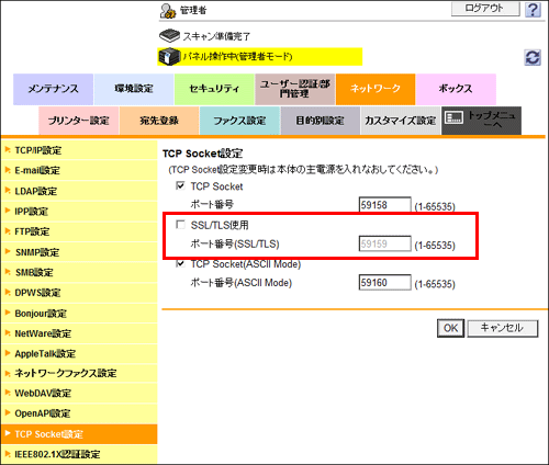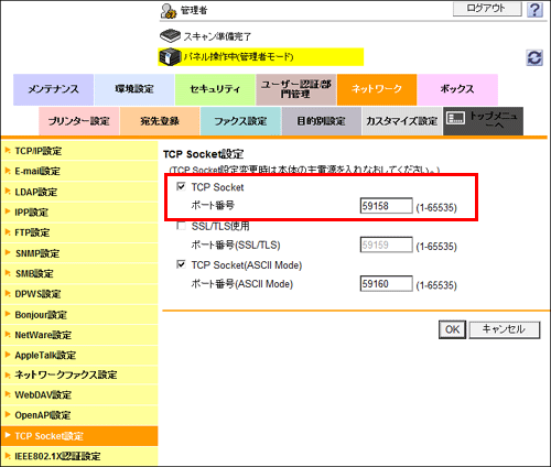 管理者モードの[ネットワーク]-[TCP Socket設定]で、次の設定をします。