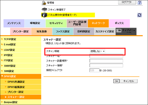 管理者モードの[ネットワーク]-[DPWS設定]-[スキャナー設定]で、[スキャン機能]を[使用する]に設定します(初期値:[使用しない])。
