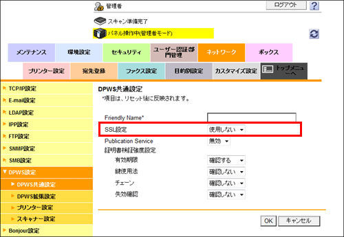 管理者モードの[ネットワーク]-[DPWS設定]-[DPWS共通設定]で、[SSL設定]を[使用する]に設定します(初期値:[使用しない])。
